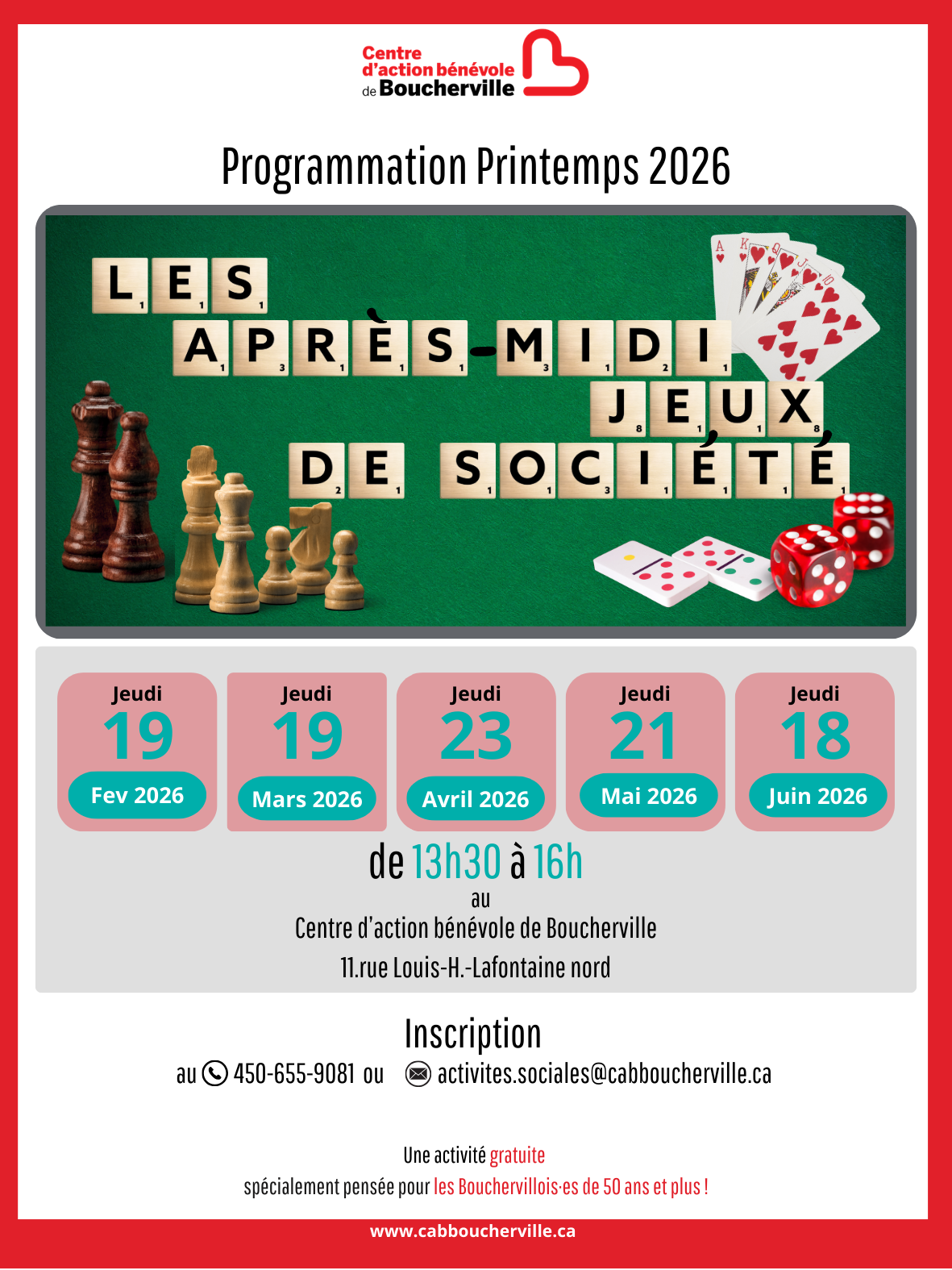 Les Après-midi jeux de sociétéVous aimez jouer aux cartes et à divers jeux de société, mais n’avez pas toujours les partenaires requis? Une fois par mois, l’équipe du CABB invite les Bouchervillois(e)s de 50 ans et plus à venir jouer à divers jeux de société. Une grande panoplie de jeux est offerte et le plaisir est garanti! Joignez-vous à nous pour passer un après-midi divertissant, animé par nos bénévoles. Les rencontres sont gratuites. Il est cependant nécessaire de s’inscrire au préalable.