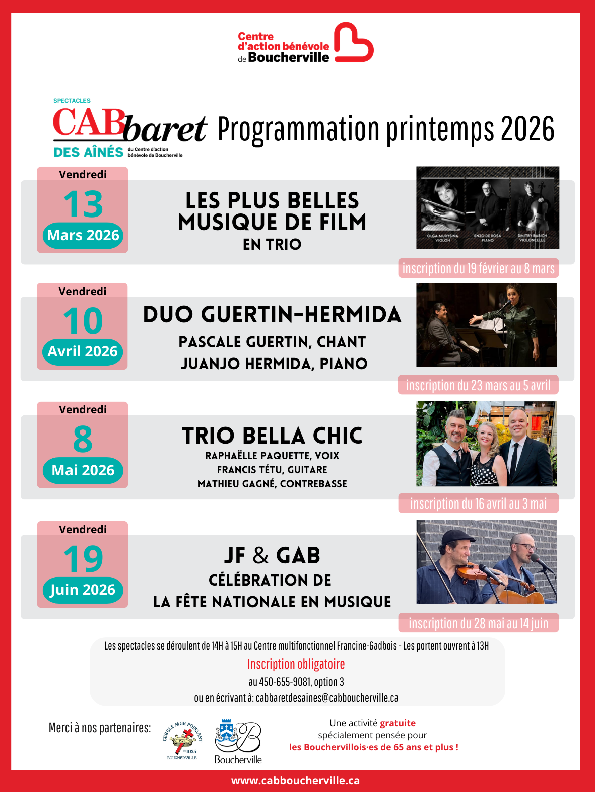 Pour en savoir davantage ou pour vous inscrire à l’un ou l’autre des spectacles du CABbaret des aînés, abonnez-vous à l’infolettre du CABB ou suivez-nous sur nos réseaux sociaux. |